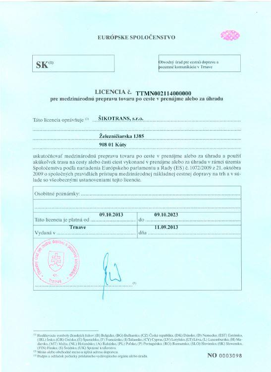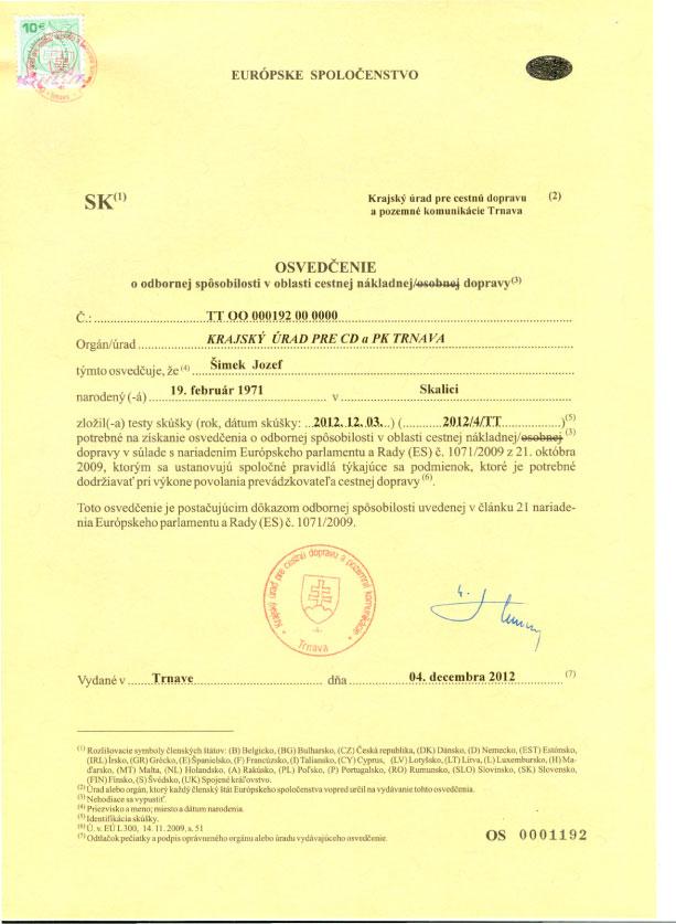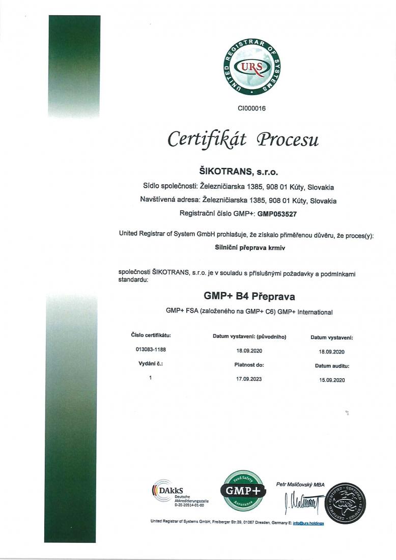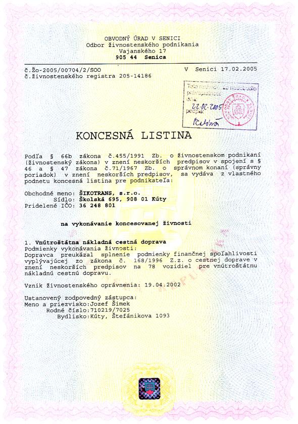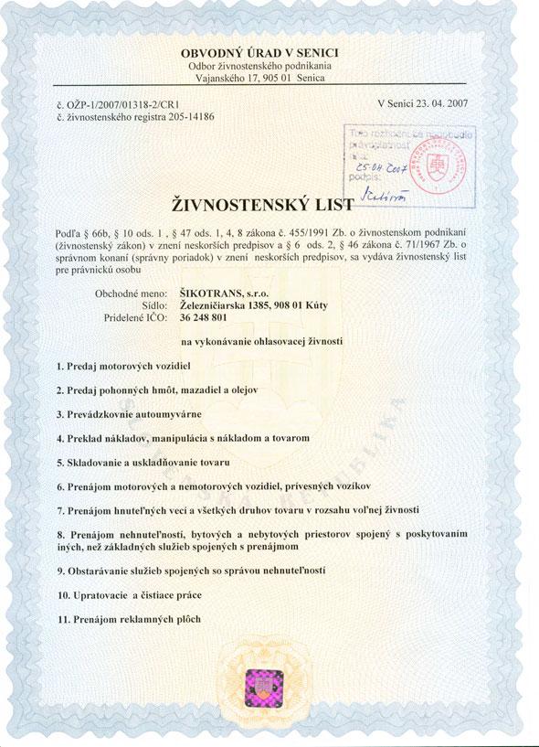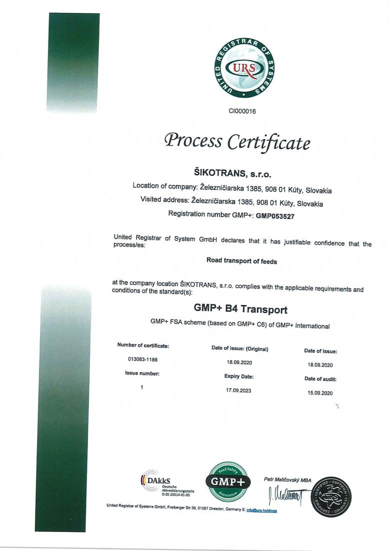 Koncesná listina, Živnostenský list, Povolenie na medzinárodnú prepravu, Osvedčenie o odbornej spôsobilosti, Ovedčenie o registrácii pre DPH a DIČ, CMR poistenie, ISO certifikát: Systém riadenia spoločnosti, Politika kvality, Certifikát solventnosti, GMP+ certifikát CZ a EN verzia.