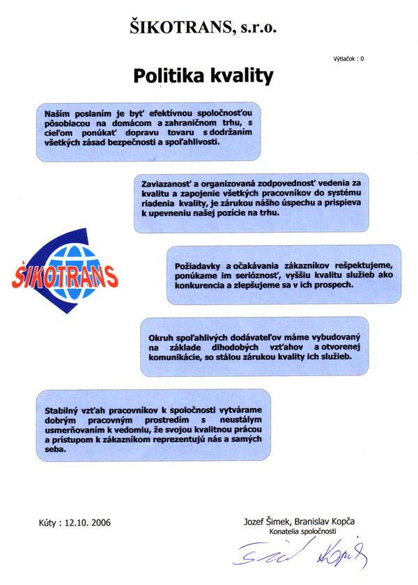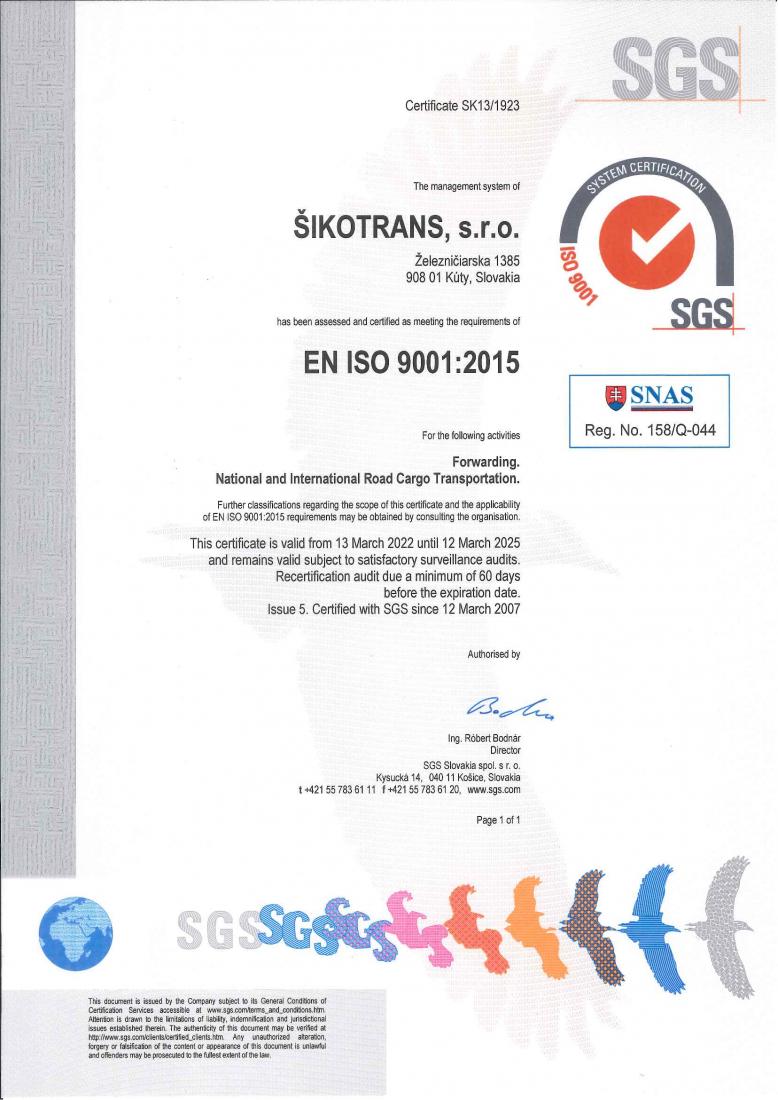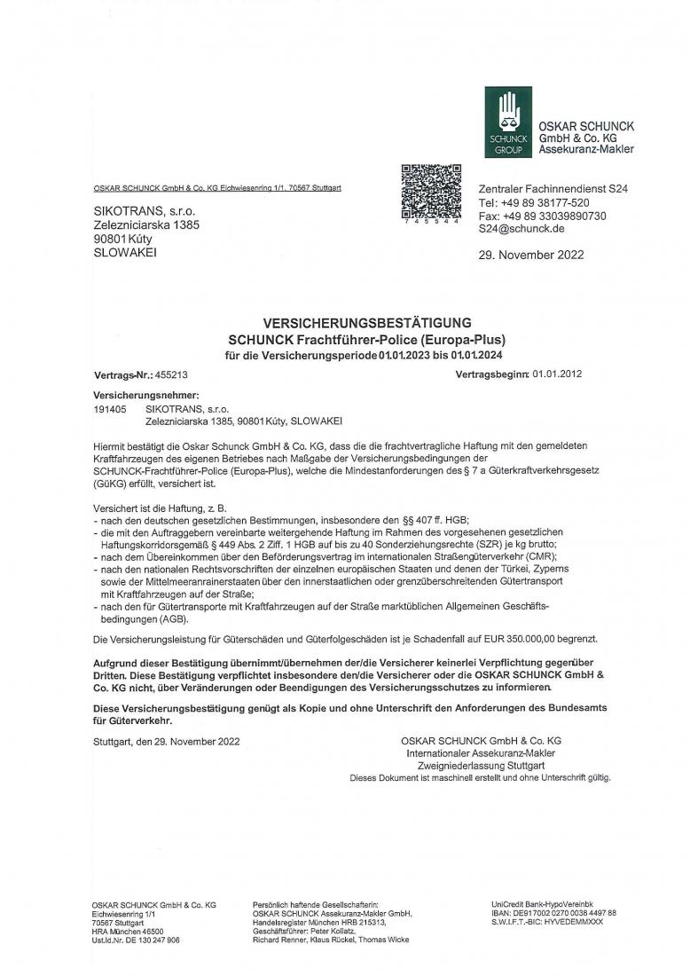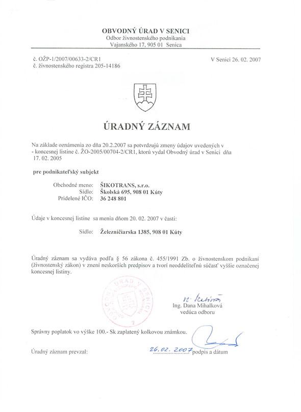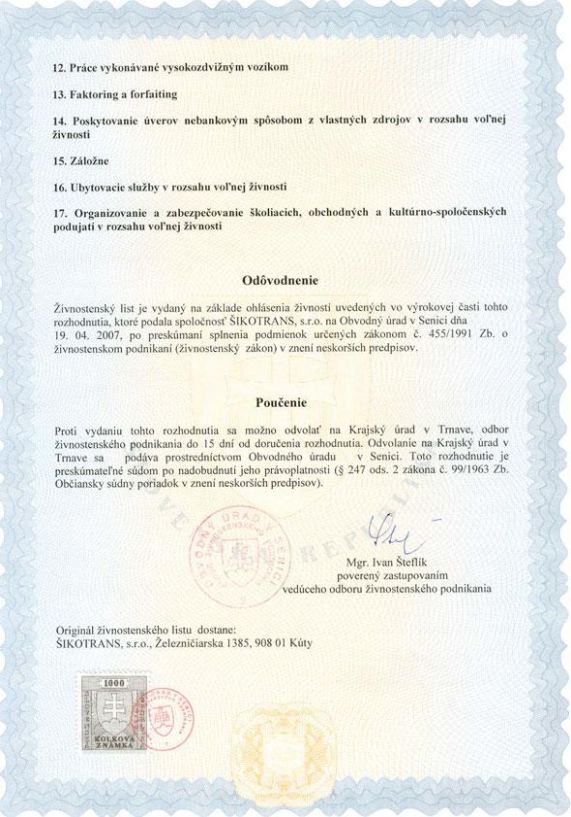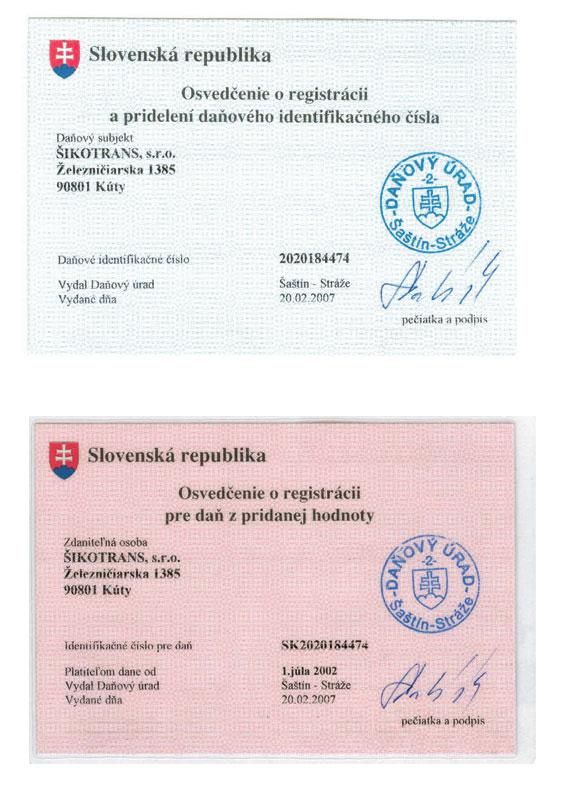 Koncesná listina, Živnostenský list, Povolenie na medzinárodnú prepravu, Osvedčenie o odbornej spôsobilosti, Ovedčenie o registrácii pre DPH a DIČ, CMR poistenie, ISO certifikát: Systém riadenia spoločnosti, Politika kvality, Certifikát solventnosti, GMP+ certifikát CZ a EN verzia.